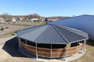 Die Longierhallen von Remtor sind eine perfekte Kombination aus Komfort und Sicherheit. Um bestmögliche Sicherheit, auch im Training mit jungen Pferden, zu ermöglichen, bieten wir standardmäßig 3,5 Meter hohe Pfosten an. Durch verschiedene Bandenmodelle, sowohl schräge als auch gerade Form, können Sie die für Ihre Reitanlage am Besten geeignete Variante auswählen. Für zusätzlichen Komfort können unsere Longierhallen mit einem sehr starken und robusten Netz umgeben werden, das vor Wind und übermäßiger Sonne schützt. Dies macht die Nutzung der Longierhalle auch an heißen Tagen angenehm. Um die Funktionalität zu erhöhen, kann ein Teil der Netzsegmente aufgerollt werden, so dass sich ein Teil der Spannweite freilegen lässt, wenn eine zusätzliche Belüftung benötigt wird. Das Dach der Longierhallen kann mit einem Oberlicht ausgestattet werden, um viel natürliches Licht zu erhalten. Der Eingang zu der Longierhalle kann mit einem zusätzlichen Vordach versehen werden, das als Wartebereich nützlich ist, wenn der Aufenthaltsbereich häufig genutzt wird. Bei der Bestellung einer Longierhalle erhält der Kunde von uns einen genauen Fundamentenplan und die Montage wird von unserem qualifizierten Team durchgeführt.